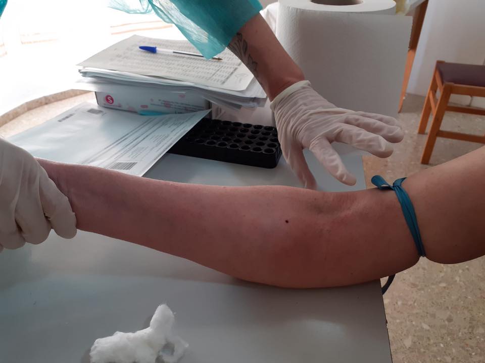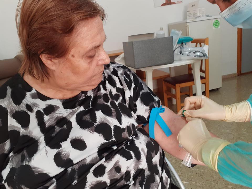Hoy continuamos con ciertas rutinas en la Residencia de P.M.D. y Centro de Día de Puçol: tomar el sol, rehabilitación, disfrutar de una buena charla…y hoy, como novedad, nos están haciendo análisis de sangre a personas usuarias y personal, para comprobar que estamos todos y todas bien.